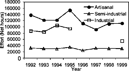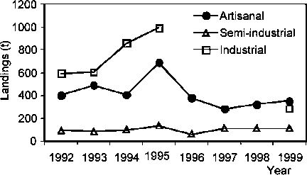 The estimated Maximum Sustainable Yield of the species in the region is about 1500 t (1300 to 1600 t). This level of exploitation was surpassed several times between 1987 and 1993 and a subsequent decline was recorded in the landings of all fleets of the region (Fig. 14.3). The reduction of the effort after 1993, followed by landings below the MSY level observed in the fishery until 1996, may explain the recuperation in stock numbers as observed in the landings after this year. The MSY was surpassed again in 1998, when approximately 1800 t were landed. If the increasing trend in effort continues, another decline in the landings can be expected in the near future. It is suggested that effort should not be allowed to increase beyond current levels of exploitation and further, it is recommended that the level of effort should be maintained below that observed in 1997. The open access management strategy that has been typically applied to artisanal fisheries in the past, should therefore be replaced by a limited effort regime, if future declines in the fisheries are to be avoided