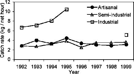 The white shrimp, P. schmitti, is captured on an occasional basis by the industrial vessels, when the resource becomes available on the fishing grounds during the rainy season. Their landings in 1999 reached 262 t, whereas the landings of artisanal fishermen, those using trawl gears and walking gear, reached 140 t. Sizes exploited by artisan fishers are juvenile shrimp, while those exploited by the industrial fleet are mature shrimp. The CPUE trend is variable and not well defined (Fig. 14.2), suggesting that the impact of fishing on the population of P. schmitti is still limited. This prevents the estimation of the optimum level of exploitation for this stock, but a limited increase of effort could be allowed provided the effect of this increase is properly monitored.