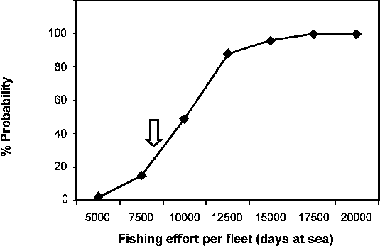 Figure 13.4 Risk of exceeding LRP (0.25 Bmax) for P. subtilis. The arrow indicates current effort at 39% probability
