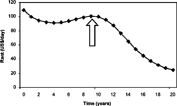 This model was used to test several management strategies and to observe the temporal fluctuations in performance variables (e.g. profits, yield, biomass) over a twenty-year simulation (1989-2009), under open access and limited effort conditions. Results showed that in an Open Access Fishery, yield and net revenues decrease along with biomass of both species. Initial biomass levels for M. furnieri and C. jamaicensis were estimated at 6 322 and 602 tonnes respectively and forecast to be 198 and 109 tonnes respectively at the end of the twenty-year period. Figure 13.7 shows the performance of the fishery based on rent and the current level is indicated at year 9. Under a Limited Entry Fishery fishing effort was fixed for trawling and monofilament gillnets at the level of effort that optimises net present value for the five fleets while the other fleets were allowed to operate under open access. Under limited entry, biomass, yield and rent improve.