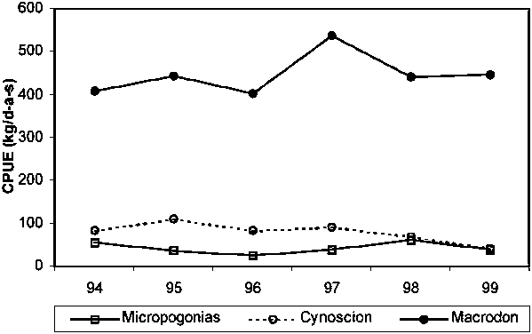 Figure 14.3 Observed CPUE time series of the three most important fish species landed by the Venezuelan industrial trawl fishery in the Gulf of Paria and Orinoco River delta