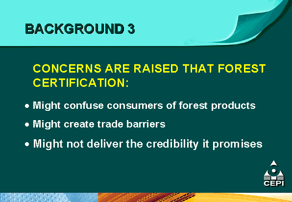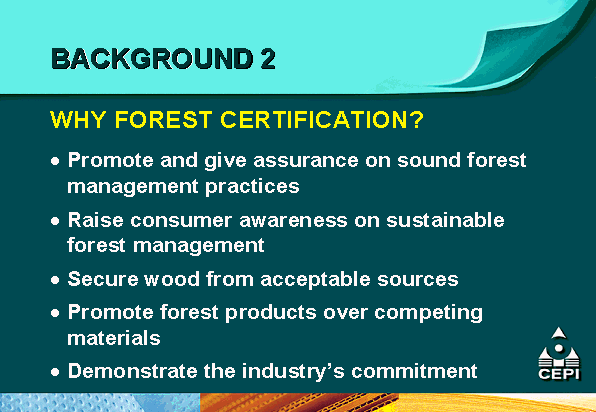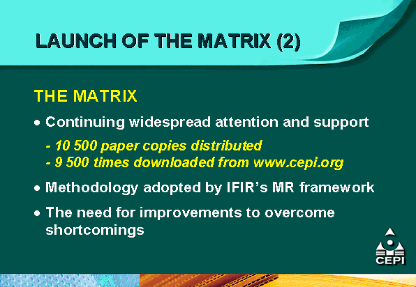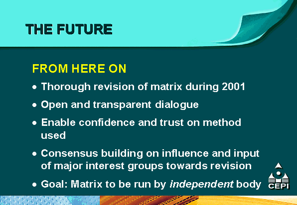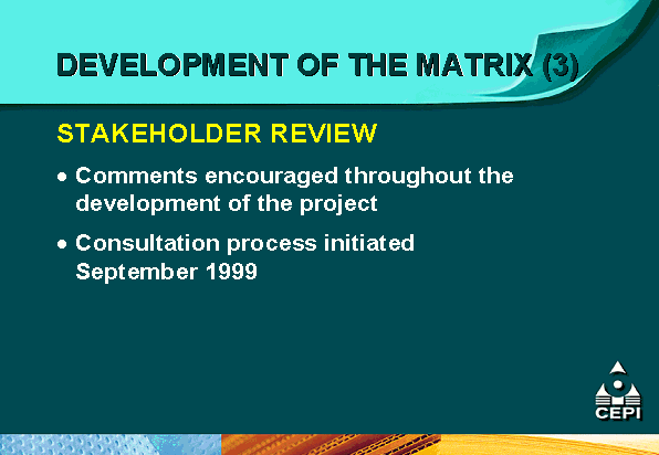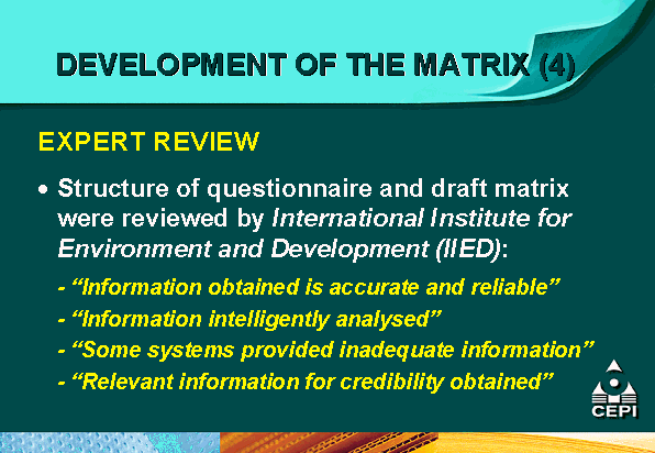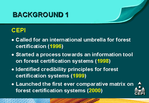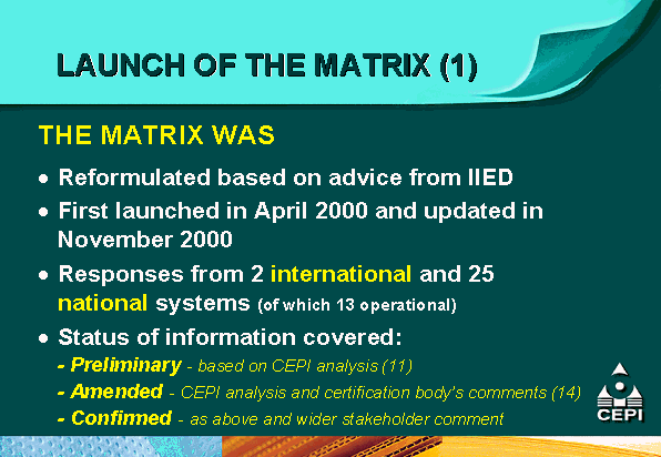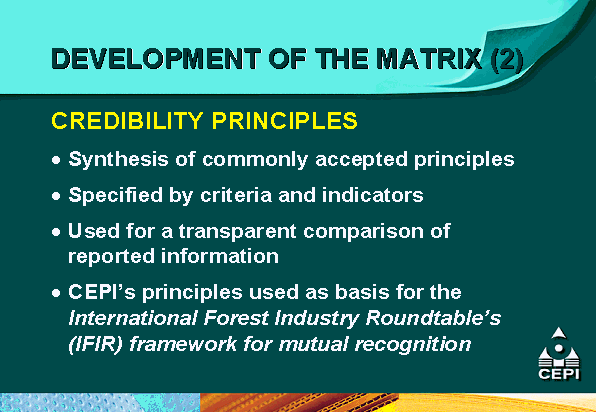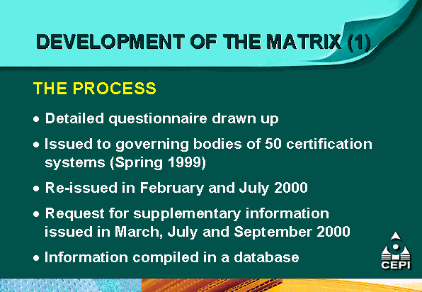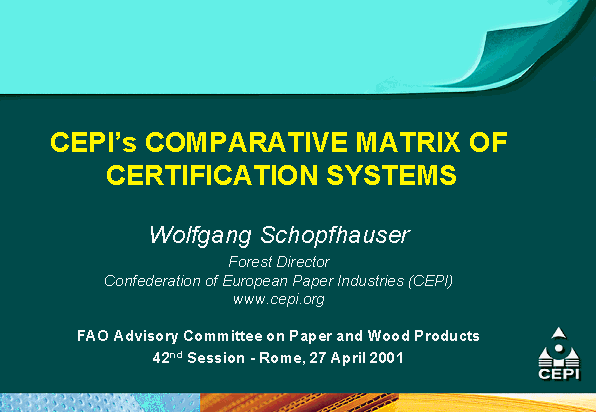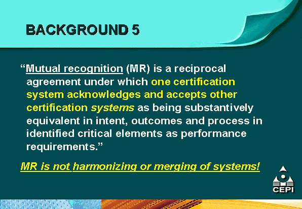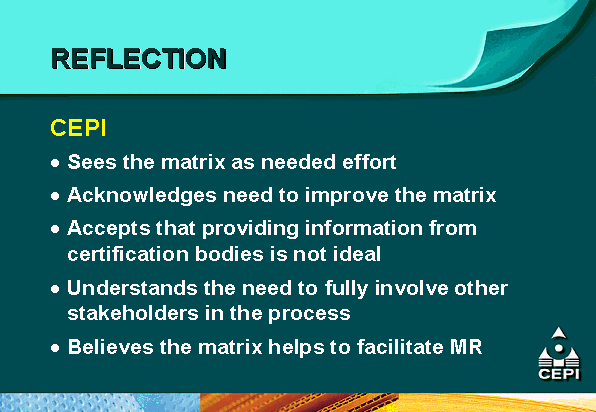 - the Confederation of European Paper Industries (CEPI) is supporting mutual recognition efforts through the development of a comparative matrix of different certification systems as an educational tool for its members and pulp and paper customers;