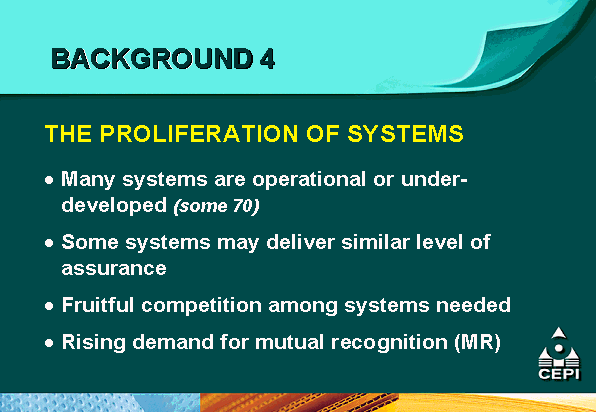 - Some participants considered that the proliferation of certification schemes was a problem, while others felt that competition and choice was a very desirable situation. Mutual recognition between schemes, or a variation, was seen by many as one solution to the problem of proliferation, while others felt that it was not appropriate. It was clear that the creation of mutual trust is an important first step if there is to be improved dialogue and cooperation between the different certification processes.