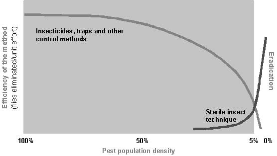 For maximum effectiveness, the sterile males released must outnumber the fertile, native male flies by a considerable margin. In order to reduce populations when conditions are highly favourable for fly reproduction, the ratio of released sterile males to native males should be at least 2 to 1 (Knipling, 1955) and may, in certain circumstances, have to be as high 15 to 1. It therefore follows that SIT is most cost-effective when the target population is low. On the other hand, insecticide applications cost the same, regardless of the insect population density and are, therefore, most cost-effective when the target population density is high. This suggests that the phased and complementary use of both "conventional" methods and SIT would result in maximum efficiency throughout the phase of intervention (Figure 1). For some populations, and for species of insect pests that have strong seasonal fluctuations, SIT releases may be initiated and the number of sterile males released cause efficient "overflooding" ratios even when native populations have not been suppressed by conventional means prior to the SIT release. Contrary