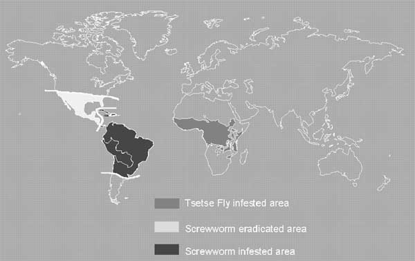The technical feasibility of eradication using SIT has been documented (Linquist et al., 1990; Hendrichs, 2000). The successful eradications of the New World screwworm fly from North and Central America (Wyss, 2000), the Mediterranean fruit fly from areas in North, Central (including Mexico, Hendrichs et al., 1983) and South America (including all of Chile, SAG, 1995), the melon fly from Okinawa Islands (Kuba et al, 1996) and the Queensland fruit fly from Western Australia (Fisher, 1996) are all well known. For many years it was argued that screwworm eradication using SIT was technically and logistically impossible, but major successes in eradicating the New World screwworm from all of North and most of Central America, as well as from North Africa, have shown otherwise. The same arguments that were once used against the feasibility, justifiability and sustainability of screwworm eradication are being used today with regard to tsetse eradication. Krafsur (1998) summarizes the controversial history of SIT in screwworm or fruit fly interventions. A comparison of screwworm and tsetse SIT development (Table 1) shows that the progression of these two applications, from laboratory development and field tests to general acceptance and use in major eradication programmes, is virtually identical.