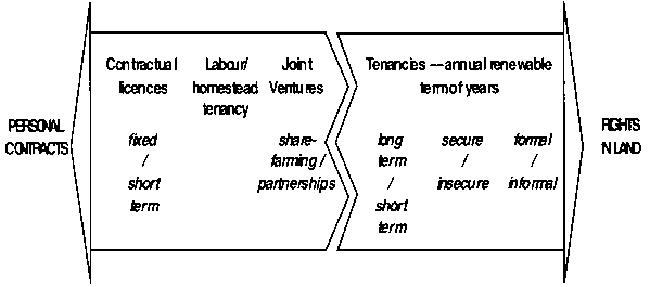 2.9 The tenancy arrangements that predominate in a given context do not always follow a linear developmental pattern (for example, from labour tenancy to sharecropping to fixed cash rentals) but tend to range back and forth from one type of tenancy to another, as conditions change. In illustrating the range of tenancies in this manner, therefore, it is not intended to imply that arrangements on the right of the range are in any way superior, or more formal, than those on the left. Rather, the illustration serves to show where each type of agreement lies in law, as well as in terms of the respective resource inputs of landowners and tenants. Agreements on the far left of the range are thus viewed firmly as personal contracts, with the expectation that all major decisions will be taken by the landowner. In contrast, those on the far right involve a transfer of property rights, with the expectation that the tenant will assume overall responsibility for the farming operations taking place on the land.