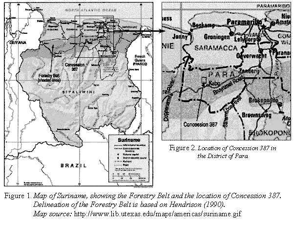 The Forest Belt, where most forest concessions in Suriname are located, is situated in a strip that begins 30-75 km from the coast and extends inland between 80 and 150 km. Concession 387 is located about 120 km south-west of Paramaribo, at approximately 5° 13´ N, 55° 40´ W. The concession lies just north of the main haul road, the so-called Bruynzeel Road, and measures about 5 km in the east-west direction and 7 km in the north-south direction (Figures 1 and 2). Logs from the concession are transported by truck to the Saramacca River where they are loaded onto barges or pontoons for transport to the capital city of Paramaribo for processing. The Coppename River west of Concession 387 is also used by some concessionaires for transporting logs to Paramaribo.