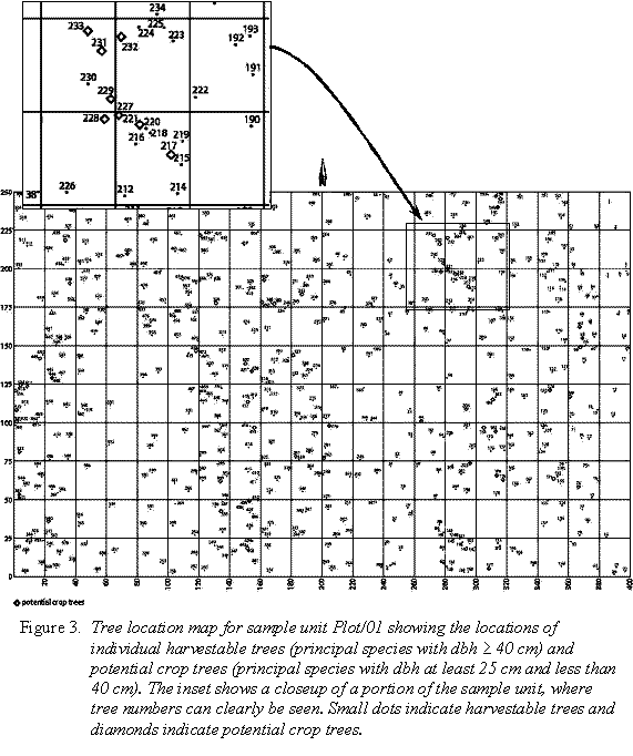 Therefore, a comprehensive pre-harvest survey was conducted for one of the sample units in the study area, namely Plot/01, to obtain data on the standing volume of commercial species and, in particular, of principal tree species occurring in the logged-over forest areas of Concession 387. In the adjacent area of sample unit Plot/02, the pre-harvest survey was limited to an inventory of principal tree species because of time constraints. The results of the pre-harvest survey for Plot/01 are summarized in Table 1.