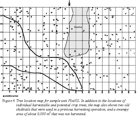 Harvest data for the two sample units are summarised in Table 5. In the table, "volume harvested" is based on the estimate of volume made by the inventory crew for each tree prior to felling. In contrast, "log volume" was determined by measuring each log after felling at the felling site. "Harvesting intensity" was calculated by dividing these log volumes by the area harvested (10 ha for Plot/01 and 9.1 ha for Plot/02).
