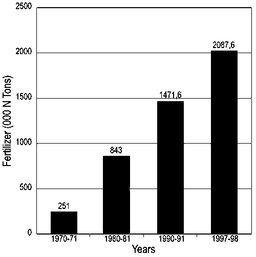 Use of brackish water for irrigation can increase the resource base for irrigated agriculture, which will help to meet increasing national food requirements. During the last decade, the cropped area increased by 1.3 percent annually, whereas population increased by 3.1 percent annually; the gap between demand and production is widening with the passage of time (Malik, 1990). Pakistan has the largest contiguous gravity-flow irrigation system, capable of handling 130 billion m3 of water (Mohtadullah et al., 1993). Currently, water supplies are annually about 30 percent short even for the present cropping intensity (Badruddin, 1983).