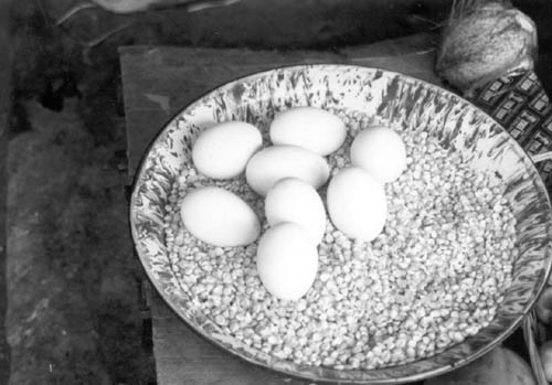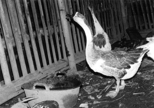 Il y a des limites dans l'emploi des diverses matières premières qui peuvent entrer dans un régime d'oies. La présence de toxiques, leur coût ou leur disponibilité sont autant de facteurs qui limitent l'utilisation de ces ingrédients. En Asie, le riz, le maïs et leurs dérivés sont les constituants majoritaires des rations pour les oies. Dans certaines régions, le sagou ou le manioc entrent également dans leur ration. Les sources de protéines sont: le tourteau de coprah, le soja ou la farine de poisson qui entrent dans la composition des aliments concentrés. Une supplémentation en herbe est intéressante pour couvrir les besoins alimentaires. La consommation journalière est variable, elle dépend de l'âge des oies et des autres constituants qui lui sont fournis. Les déchets de cuisine peuvent également constituer un apport substantiel et contribuer à l'équilibre de la ration (figure 5). Le grappillage d'aliments par les oies en système extensif est une pratique très répandue. Un troupeau d'oies composé de 4 à 20 unités est capable de trouver son alimentation et d'entretenir les abords d'un petit village. Les oies peuvent également être maintenues dans des conditions moins libérales: dans des enclos proches de la maison du fermier, des canaux, des lacs ou des rizières où on leur autorise un accès contrôlé. Elles sont alors nourries avec des déchets de cuisine et tout ce qu'elles peuvent trouver dans le périmètre qui leur est alloué. En ce qui concerne les oies en production, le pic de ponte oscille entre 20 et 45 pour cent en fonction du système d'alimentation. Les ufs produits selon cette méthode sont vendus individuellement sur les marchés (figure 6), la collecte de ces ufs et leur conservation n'offrant pas toujours toutes les garanties en matière d'hygiène. Les systèmes d'élevage des petits producteurs sont parfois mal maîtrisés et les programmes alimentaires mal adaptés. On fait beaucoup confiance aux méthodes traditionnelles (alimentation à base de riz uniquement), ou naturelles (couvaison par une oie ou une cane), mais ces méthodes ne permettent pas d'obtenir les résultats optimums.