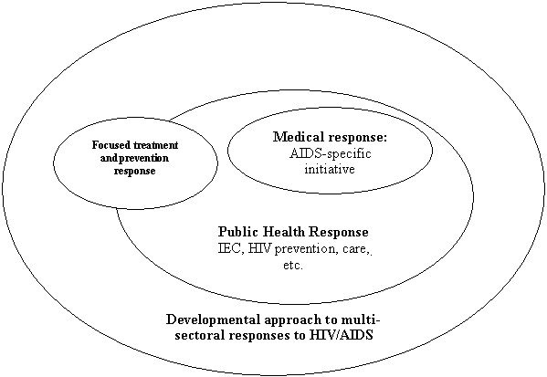 Figure 2 below depicts the various approaches of response to HIV/AIDS, inclusive of the developmental approach discussed above. In a developmental paradigm of response to HIV/AIDS, the focused treatment and prevention response forms part of the multi-sectoral and public health responses. The issue of the relevance of agricultural policies, strategies and programmes to the conditions being created by the epidemic would be placed into sharp focus in a developmental approach to multi-sectoral responses to HIV/AIDS.