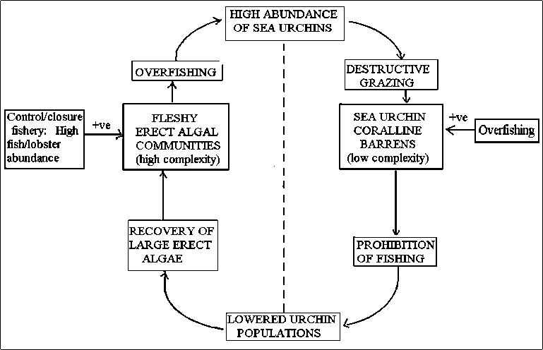 Figure 5.1 An example redrawn from Pinnegar et al. (2000) illustrating how overfishing sea urchins may tip the ecosystem from dominance by large algae to coralline barrens with minimal cover. (+ve implies a reinforcement of the box pointed to).