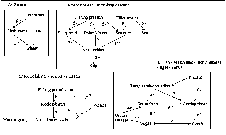 Examples shown in Figure 5.2 (after Pinnegar et al. 2000) are: (A) the basic concept of a three-level trophic cascade involving plants, grazers and their predators; and specific examples of trophic cascades for: (B) Northeast Pacific kelp ecosystems, and the sensitivity of algal cover to predation on sea urchins by other food web components; (C) South African mussel and macro-algal equilibria affected by over-harvest of rock lobsters, showing also a reciprocal predator-prey relationship between rock lobsters and whelks (depending on their relative densities); and (D) a typical Caribbean coral reef ecosystem, where overharvesting of reef fish can lead to urchin explosions and decimation of algae, or where either predation on sea urchins or the disease epidemics they are prone to, can lead to coral overgrowth by algae. From all these examples, one can deduce the facility with which overharvesting of a keystone component (Paine, 1994; Power et al., 1996) of a food web can lead to major changes in productivity and holding capacity, if not to a transition to a quite different assemblage of species.