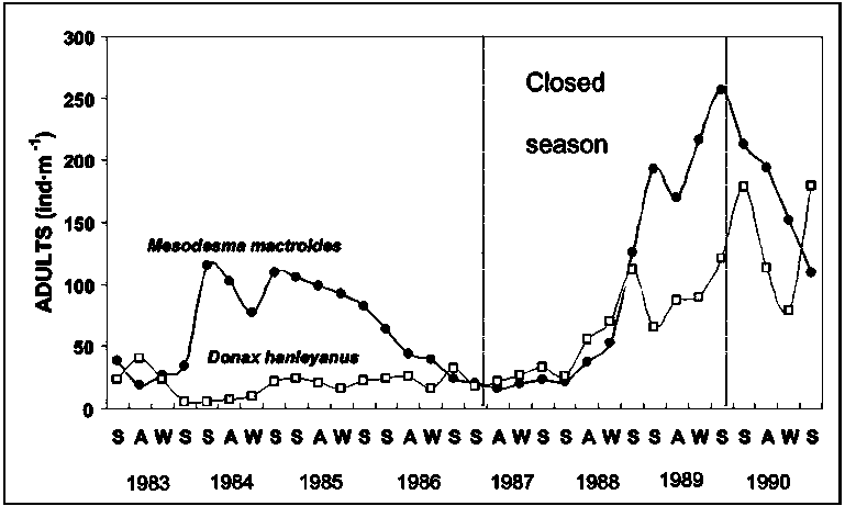transect: ind·m-1) of adults of M. mactroides