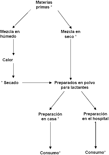 Según los expertos de la industria de los Estados Unidos y Europa, los preparados en polvo para lactantes se pueden fabricar de diversas maneras. En el diagrama de su producción y uso se destacan algunos puntos en los que se podría producir contaminación bacteriana (Figura 2).