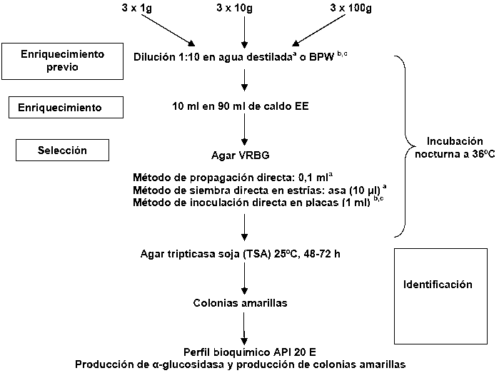 Aislamiento primario: Tanto E. sakazakii como S. enterica se aislan utilizando un sistema de enriquecimiento previo, enriquecimiento y agar diferencial selectivo. Para Salmonella se someten a prueba volúmenes múltiples de 25 g (n=60) (CAC, 1979; ICMSF, 1986), mientras que para E. sakazakii se utiliza el sistema del número más probable con volúmenes múltiples de 100 g, 10 g y 1g (Figura 4) (Muytjens, Roelofs-Willemse y Jasper, 1988; Nazarowec-White y Farber 1997b; USFDA, 2002). Para ambos microorganismos los supuestos aislamientos se confirman mediante pruebas bioquímicas o con una base genética (Anon., 1996; Kandhai, Reij y Gorris, 2004). Los métodos para Salmonella han sido validados por organizaciones internacionales, pero no en el caso de E. sakazakii. Una característica de la mayor parte de las cepas de E. sakazakii es la producción de un pigmento amarillo no difusible por debajo de 37ºC. Sin embargo, éste no es un rasgo exclusivo, pues se encuentra con frecuencia en Pantoea, género estrechamente relacionado que también se ha aislado de preparados en polvo para lactantes reconstituidos (Muytjens, Roelofs-Willemse y Jasper, 1988; Iversen y Forsythe, 2004). Además, hay cepas blancas de E. sakazakii (Block et al., 2002). Un segundo rasgo común utilizado en la identificación presunta es la producción de á-glucosidasa (Muytjens, van der Rose-van de Repe y van Druten, 1984; Iversen, Druggan y Forsythe, 2004). Hay métodos validados internacionalmente para patógenos específicos, B. cereus, C. perfringens y S. aureus, y para los coliformes y enterobacteriáceas que son microorganismos indicadores (USFDA Bacteriological Analytical Manual; Health Canada Compendium of Methods, ISO, Ginebra). No existe ningún método internacionalmente validado para enterobacteriáceas específicas como E. sakazakii, E. cloacae y C. koseri. Con frecuencia se utilizan perfiles bioquímicos después del primer aislamiento (Figura 4), pero pueden surgir contradicciones en la identificación al utilizar estuches bioquímicos diferentes para la misma cepa (Iversen, Druggan y Forsythe, 2004). Habría que realizar ulteriores investigaciones sobre la diversidad genética y los rasgos distintivos de E. sakazaki y los microorganismos conexos.