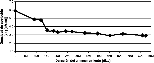 Edelson-Mammel y Buchanan (R. Buchanan, comunicación personal, 2004) estudiaron la supervivencia a largo plazo de E. sakazakii preparando una cantidad de producto en polvo para lactantes de manera que una vez reconstituido según las instrucciones del fabricante contuviera alrededor de 106 ufc/ml de E. sakazakii. En el curso de alrededor de un año y medio, estos preparados inoculados se almacenaron a temperatura ambiente en un frasco cerrado con tapón de rosca. Periódicamente se tomaban muestras del preparado, se hidrataban y se determinaba la concentración de células viables mediante siembra en placa por duplicado en agar tripticasa soja. Durante los cinco primeros meses de almacenamiento, la concentración de E. sakazakii viable se redujo en 2,5 ciclos logarítimicos (de 6,0 log ufc/ml a 3,5 log ufc/ml) a un ritmo de alrededor de 0,5 ciclos logarítimicos al mes. En el transcurso del año sucesivo, la concentración de E. sakazakii viable disminuyó otros 0,5 ciclos logarítimicos, hasta alcanzar un valor aproximado de 3,0 log ufc/ml (Figura 5). Estos resultados demuestran claramente que E. sakazakii puede sobrevivir en los preparados en polvo para lactantes durante períodos prolongados.