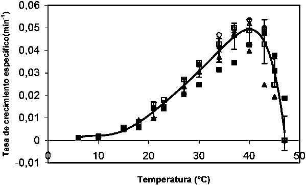 Farmer et al. (1980) examinaron 57 cepas de E. sakazakii e informaron del crecimiento del microorganismo a 25°, 36° y 45°C. De las cepas sometidas a prueba, 50 crecieron a 47°C, pero no a 4° o a 50°C. Nazarowec-White y Farber (1997b) informaron de que las temperaturas mínimas de crecimiento para E. sakazakii en una infusión de corazón y cerebro oscilaban entre 5,5° y 8°C; y las cepas comenzaban a morir lentamente a 4°C. Además, las temperaturas máximas de crecimientos para los aislamientos clínicos y alimentarios eran de 41° a 45°C (véase también Gavini, Lefebvre y Leclerc, 1983). Esto tiene repercusiones para los caldos de enriquecimiento que tienen una temperatura de incubación recomendada de 45°C. Iversen, Lane y Forsythe (2004) y Zwietering (comunicación personal, 2004) han medido la tasa de crecimiento de E. sakazakii en preparados en polvo para lactantes (Figura 6). Los tiempos de generación de E. sakazakii en los preparados en polvo para lactantes oscilaban a 10°C entre 4,15 y 5,52 horas y a 22°C entre 37 y 44 minutos. Los intervalos a 10° y 23°C variaban entre 19 y 47 horas y entre 2 y 3 horas, respectivamente (Nazarowec-White y Farber, 1997b). Iversen, Lane y Forsythe (2004) examinaron cepas clínicas y alimentarias y comprobaron que los tiempos de generación de E. sakazakii en los productos para lactantes reconstituidos eran de 13,7 horas, 1,7 horas y 19-21 minutos a 6°, 21° y 37°C, respectivamente. La relación entre la temperatura y la tasa de crecimiento específico en los distintos estudios se resume en la Figura 6. Por consiguiente, es evidente que el almacenamiento inadecuado de los preparados en polvo para lactantes reconstituidos puede favorecer el crecimiento rápido de E. sakazakii.
