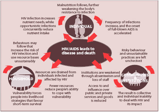 Poverty and gender inequalities exacerbate the spread and impact of HIV/AIDS in multiple ways. Poverty increases HIV transmission through inferior health care, increased labour migration and the associated risk of having multiple partners, and survival sex. In desperation, women and children barter sex for money and food, exposing them to the risk of infection. For people who are already infected with HIV, poverty-linked malnutrition increases susceptibility to opportunistic infections, leading to an earlier onset of full-blown HIV/AIDS (FAO/SOFI, 2003). HIV/AIDS has a greater economic impact on poor than better-off households as it forces these households to draw on their assets to cushion the shock of illness, death and orphans. Further, HIV/AIDS has a disproportionate impact on the lives of women as women carry the brunt of the burden in caring for the sick and for orphans while also securing a livelihood for the household. HIV/AIDS worsens gender-based differences in access to land and other productive resources like labour, technology, credit and water. In those situations where a wife survives the death of her husband from HIV/AIDS, the weak position of women, and the stigma attached to the disease, contributes to excessive stripping or grabbing of productive assets from the surviving widow and her children, once the husband is deceased. Moreover, disempowerment of women makes it more difficult for them to protect themselves from being infected by their partners, exposes them to sexual abuse, and limits their access to knowledge about how to protect themselves (UNDP, 2002).