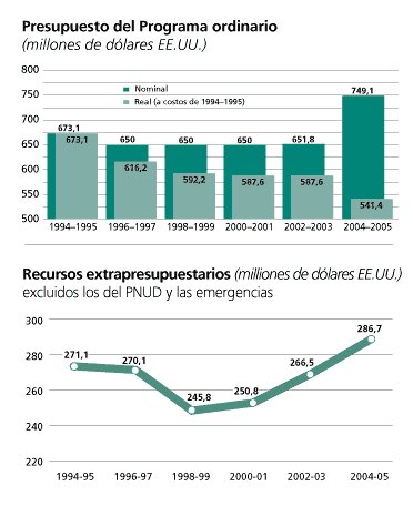 Las actividades de la FAO se financian mediante los recursos de su Programa Ordinario y contribuciones extrapresupuestarias de carácter voluntario. El Programa Ordinario, que se establece y aprueba por un período bienal, se sufraga mediante las cuotas de los Estados Miembros. La escala de cuotas utilizada por la FAO se basa en el sistema adoptado por la Asamblea General de las Naciones Unidas (NU). Desde 1994, el presupuesto del Programa Ordinario de la FAO ha disminuido un 24,3 por ciento en términos reales. En el bienio 1994-1995, el presupuesto de la Organización fue de 673 millones de dólares EE.UU. Para mantener el mismo poder adquisitivo, no obstante la depreciación del dólar, hubiera sido necesario un presupuesto de 931,3 millones de dólares EE.UU. para el bienio 2004-2005. En cambio, el presupuesto aprobado fue de 749,1 millones de dólares, lo que determinó una reducción de los programas por valor de 51,2 millones de dólares EE.UU. con respecto al del bienio 2002-2003. Los fondos extrapresupuestarios provienen de contribuciones voluntarias a la Organización aportadas principalmente por gobiernos, entidades de las Naciones Unidas (por ejemplo, el Programa de las Naciones Unidas para el Desarrollo, la Oficina de Coordinación de Asuntos Humanitarios de las Naciones Unidas, etc.) e instituciones financieras internacionales (por ejemplo, el Banco Mundial). Si bien se ha registrado una disminución constante de actividades financiadas por el PNUD, que se prevé que alcanzará tan solo la cifra de 12,2 millones de dólares EE.UU. en 2004-2005 frente a los 148,4 millones de 1994-1995, la cantidad total destinada a proyectos de desarrollo financiados por otras contribuciones voluntarias se mantuvo más bien estable durante dicho período e incluso se incrementó sustancialmente durante los tres últimos bienios, pasando de 245,8 millones de dólares EE.UU. en 1998-1999 a 286,7 millones previstos para 2004-2005 (véase el gráfico). Durante el mismo período, los recursos extrapresupuestarios movilizados para ayuda de emergencia variaron considerablemente en función de las circunstancias desde 55 millones de dólares EE.UU. alcanzados en 1994-1995 al pico de 325 millones de dólares EE.UU. en 2000-2001 alcanzado como resultado del programa de Irak, y se prevé que se llegue a los 200 millones de dólares EE.UU. en 2004-2005.