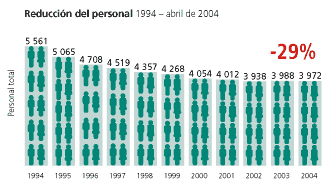 - Reducción del personal - Durante el período de diez años comprendido entre enero de 1994 y abril de 2004, la FAO redujo su personal (Programa Ordinario y Programa de Campo) en un 29 por ciento aproximadamente, pasando de 5 560 a 3 972 funcionarios. Este esfuerzo se centró en la reducción de los niveles directivos, así como del número de puestos de nivel superior y en el aumento de la proporción del personal de niveles inferiores. Esta estrategia determinó una disminución del 27 por ciento de los puestos directivos y del 42 por ciento de los puestos profesionales de nivel inferior.