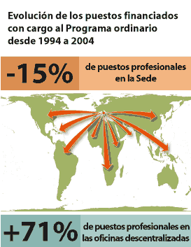- Descentralización - A fin de acercar las actividades adonde más se necesitan, la Organización creó cinco nuevas oficinas subregionales con equipos pluridisciplinarios para prestar servicios a grupos de países con características similares. Grupos de personal técnico, de asistencia en materia de políticas y de operaciones fueron transferidos de la Sede a las oficinas descentralizadas. El alcance de la descentralización fue considerable y determinó un aumento del 71 por ciento del número de puestos profesionales descentralizados. La proporción de personal en las oficinas descentralizadas con respecto al de la Sede, que, en 1994, era del 18,5 por ciento, en 2004 pasó al 27,3 por ciento. Se prevé que, en el bienio 2004-2005, la FAO estará representada en 133 Estados Miembros, en comparación con 106 en 1994. Las conexiones en el plano nacional se reforzaron aún más gracias al nombramiento de funcionarios profesionales nacionales calificados, cuyo costo es por lo demás muy inferior al de los funcionarios internacionales.