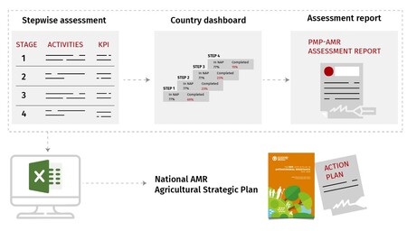 The FAO-PMP-AMR serves as a guide to help countries put their AMR-NAPs into action. The progressive approach enables step-by-step improvements toward the sustainable use of antimicrobials and management of AMR. These improvements can start as small-scale initiatives, evolve into broader actions in priority sectors and eventually develop into fully-fledged, ‘One Health’ NAPs addressing AMR in all food and agriculture sectors nationwide.