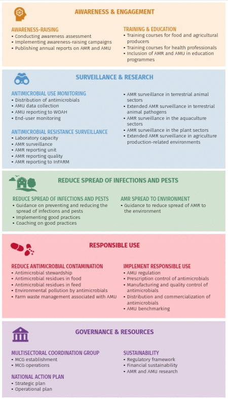 Each focus area contains specific topics proposed to be addressed in the AMR-NAPs. Each topic consists of activities at four steps where it requires specific actions be implemented in order for countries to advance to the next step. The FAO-AMR-PMP provides guidelines, standards and references to help with the planning and implementation of each activity.