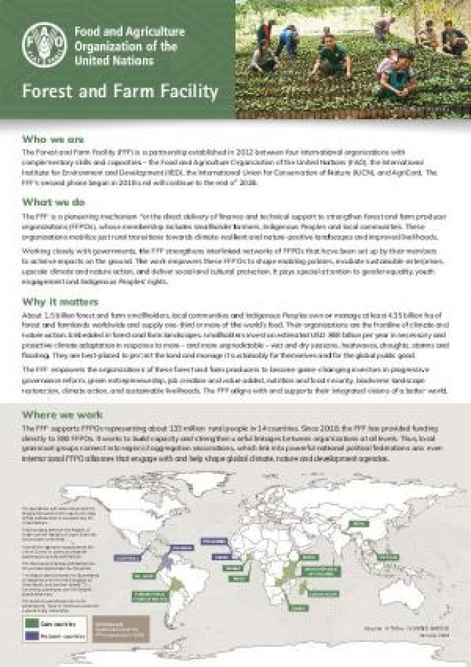 This new factsheet presents the Forest and Farm Facility (FFF), a global partnership between FAO, IIED, IUCN and AgriCord. It outlines FFF’s mission to strengthen forest and farm producer organizations and highlights key impacts achieved through its support for sustainable livelihoods, climate resilience and inclusive value chains.