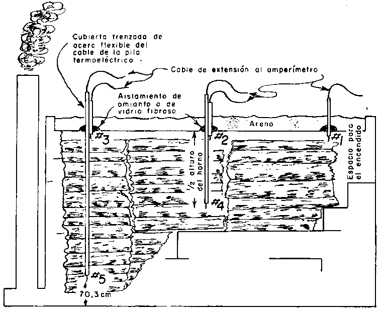 Se ha observado que bastan 5 pilas termoeléctricas para la regulación de la combustión de un horno de una capacidad de 9 cuerdas. Se colocan 3 en el centro del horno, atravesadas, cerca del techo, como se indica en la Figura 5, y otras dos se colocan en el centro del horno en el sentido longitudinal, y exactamente encima de la boca de la chimenea cerca del fondo. La del centro del horno debe estar en el punto intermedio entre el techo y el piso, y la colocada encima de la chimenea debe estar a unos 60 centímetros (2 pies) del piso. Durante el período de encendido, después de la llamarada inicial, las temperaturas en la pila termoeléctrica número 1 pueden alcanzar de 650 a 750° C. (1.200 a 1.400° F.). No hay que permitir que esta temperatura tan elevada se mantenga más de 10 ó 15 minutos y, aun así, tan sólo si el techo del horno es de acero laminado. Después de cerrar los respiraderos en la parte superior y la boca de carga, se regula la temperatura ajustando y reduciendo el tiro de aire en las bocas situadas en la parte lateral del horno. Entonces, hay que procurar que baje a 500° C. (950° F.) la temperatura en la pila termoeléctrica 1.