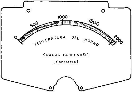 El método de instalación es el siguiente: Se prepara una escala nueva, como se indica en la Figura 6, para el microamperímetro, que pueda leerse o en grados Fahrenheit o en grados centígrados. Esta va cuidadosamente cementada en el dorso de la placa de la escala, sacada del microamperímetro, que se coloca al revés. Se instala entonces el instrumento en una caja según se ve en la Figura 7. Se empalma un alambre corto de constantán al borne positivo del amperímetro, y. se conecta a un trozo de alambre de hierro que forma una unión visible de referencia (fría) según se indica. Se une al borne negativo del amperímetro un trozo más largo de alambre de constantán. Ambos cables del amperímetro se unen a los bornes con tornillo en la parte de atrás de la caja. Entonces el cable de extensión de cualquiera de las pilas termoeléctricas dentro del horno pueden unirse a estos bornes de conexión, cuidando de que cada tipo de alambre se una al propio borne. El cable de extensión lleva a la parte superior del horno, en donde cada lado está soldado al lado apropiado del alambre de la pila termoeléctrica que llega a través del techo. El extremo del alambre de la pila termoeléctrica, en el punto en que se ha de leer la temperatura, tiene su aislamiento desencapado en unos 5 centímetros (2 pulgadas) aproximadamente desde la parte de atrás del casquillo, y los dos alambres van enrollados juntos y soldados al casquillo.
