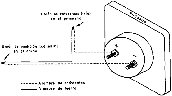El pirómetro consiste en un microamperímetro D.C. de 0 a 25, con 2.200 ohms de resistencia. Este instrumento cuesta unos 20 dólares en los Estados Unidos. Las pilas termoeléctricas consisten en alambres de constantán pareados con hierro, con un aislamiento de amianto y una cubierta trenzada de acero inoxidable. Este cable pareado de calibre 16 ó 18, cuesta en los Estados Unidos unos 28 a 30 centavos por cada 30 centímetros (1 pie), y se utiliza para las instalaciones dentro del horno, como se indica en la Figura 5. En el exterior del horno, puede utilizarse una extensión más barata de cable pareado de constantán y hierro de calibre 24, con un aislamiento de polivinilo impermeable, que cuesta aproximadamente 3 centavos el pie.
