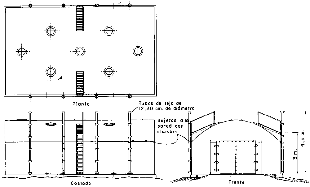 Para estos hornos mayores, se suele utilizar también una cubierta de chapas de acero ondulado (calibre 18) que descansa en un armazón de tubo de hierro (Figura 3), suspendido a su vez de vigas de acero o cabrios de madera. Las varillas de acero de esta estructura superior atraviesan unos orificios en la chapa del techado y rodean los tubos que los soportan por debajo. Los orificios de la chapa que dan paso a las varillas se obturan herméticamente con lana de vidrio, y todo el techo se cubre con una capa de arena, de 5 a 10 centímetros (2 a 4 pulgadas) de espesor para cerrarlo herméticamente. Se abren unos orificios de 20 a 25 centímetros (8 a 10 pulgadas) de diámetro en el techo inmediatamente detrás de la puerta, y dos más en la parte trasera, frente a la chimenea. Están cubiertos con chapas de acero de 5 centímetros (2 pulgadas) más de diámetro que también quedan herméticamente ajustadas con una capa de arena. Se han hecho ensayos para utilizar en estos hornos chimeneas múltiples, pero todavía no ha podido determinarse con precisión si este sistema tiene más ventajas que el corriente de una chimenea única de gran diámetro montada sobre una caja subterránea en el fondo del horno (Figura 4).
