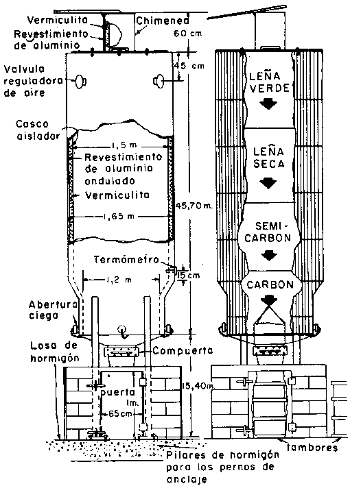 El más sencillo y económico de los actuales modelos de estas retortas es el proyectado por Fenimore Thomas (Figuras 13 y 14). Ya hay dos fabricantes que venden esta retorta. La de tamaño más pequeño y fabricada por Vega Industries de Siracusa, Nueva York, se compone de una unidad de carbonización de acero de 366 centímetros (12 pies) de alto, 122 centímetros (4 pies) de diámetro, y cuesta unos 1.000 dólares. Otra de tamaño mayor, con una cámara de acero de 456 centímetros (15 pies) de alto por 168 centímetros (5 pies y 6 pulgadas) de diámetro la vende la Charcoal Retort and Equipment Co., Spruce Pine, Carolina del Norte, por unos 2.400 dólares. Esta última retorta tiene varios aditamentos, entre ellos dos termómetros; pero prácticamente las dos retortas descritas y su funcionamiento son idénticos. El método de funcionamiento es el siguiente: Se prende el fuego en el fondo de la retorta, dejando caer leña menuda seca y papeles por la chimenea, abriendo todos los ventiladores situados cerca del fondo del cuerpo de la caldera, y encendiendo la carga a ¿revés de uno de ellos con una antorcha de trapos empapados en petróleo. Cuando el fuego arde ya bien, se hace caer madera verde por la chimenea, dejando que prenda y después se cierran las puertas. Se abre una de las válvulas reguladoras del aire (generalmente la que se encuentra en el lado resguardado del viento) y se cierra parcialmente la chimenea. Se echa madera verde a la carga de tanto en tanto, hasta que la caldera esté llena, y se crea una disposición como la que se indica en la Figura 14 (derecha). Posteriormente se abre, a unas dos o tres horas de intervalo, el compartimiento del bloque de cemento en la parte inferior de la retorta, se coloca un tambor vacío debajo de la compuerta, se abre ésta y se recogen unos 900 a 1.350 kilogramos (200 a 300 libras) de carbón de leña caliente en el tambor, utilizándose una barra de acero que se introduce a través de los orificios. Se cubren los tambores una vez llenos y se sacan del compartimiento para el enfriamiento. Cada vez que se saca carbón de leña se carga con nueva madera verde a través de la chimenea, de tal manera que esta retorta puede estar funcionando continuamente las 24 horas del día. En la más pequeña de estas retortas se obtiene algo así como una tonelada y media de carbón de leña con una carga de costeros verdes y recortes. La mayor produce casi tres toneladas, con material verde, y si se trata de madera secada al aire el rendimiento de ambas es prácticamente el doble.
