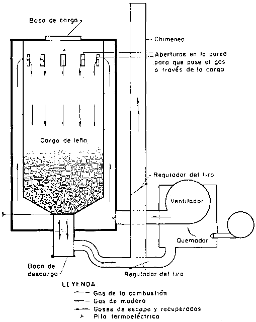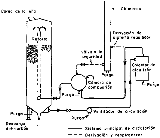 En la cámara de combustión se enciende el fuego exterior varias horas antes de empezar la carbonización con lo que la temperatura de la cámara superior es de 510° C. (950° F.) que son los que hace falta para la carbonización de la madera. Los gases volátiles que se producen en el proceso de la carbonización alimentan nuevamente la cámara de combustión exterior, mantienen dicha temperatura y el proceso se hace automático sin ninguna fuente suplementaria de calor.