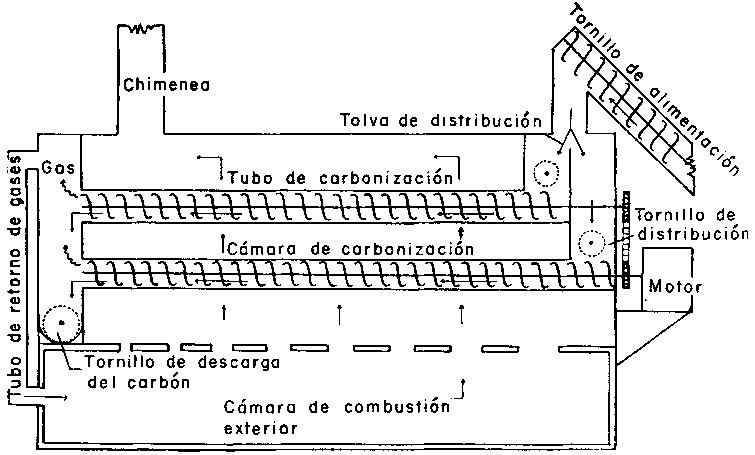 Recientemente, sin embargo, se han ideado varios sistemas de carbonización que utilizan tubos horizontales con molinete de hélice para la alimentación y transporte de la carga que hay que carbonizar. Algunos de estos aparatos están ahora funcionando comercialmente con éxito considerable.