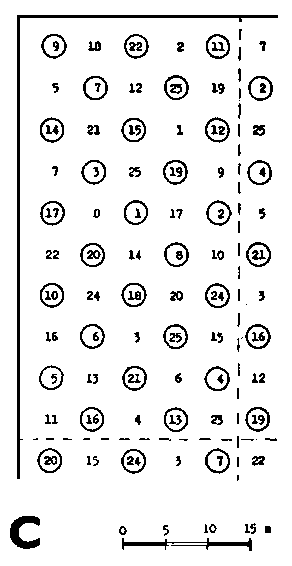 C. A sketch showing the arrangement of the grafts in one part of an orchard containing 25 clones. At the first thinning every other tree is removed.