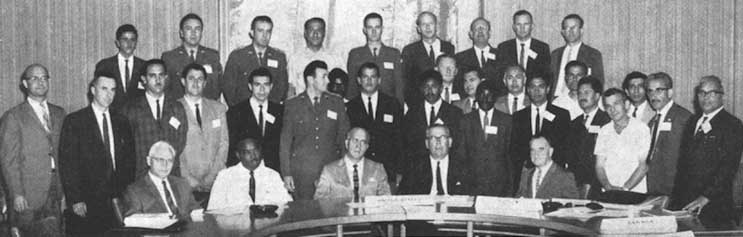 Participants at the opening in Washington D.C. of a training course and study tour on forest fire control practices and methods. This course, for the benefit of 28 trainees from 15 countries, WAS held in July and August in the United States of America (Southern States, California, Oregon and Montana) and Canada (Ontario and Quebec), under arrangements made between FAO, the United States Forest Service, the Canadian Forest Department, and the United States Agency for International Development (US/AID). Seated at the table (left to right) are V. L. Harper, Deputy Chief, United States Forest Service; R. W. Kitchen, Director of International Training, AID, F. P. Cliff, Chief, United States Forest Service: N. A. Osara, Director of FAO's Forestry and Forest Products Division, and A. A. Brown, Technical Director of the study tour in the United States.
