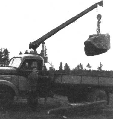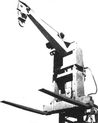 Tico hydraulic crane. - The jib, which is in three telescoping sections, can be adjusted in length. At the base of the jib is a winch powered by a 7-cylinder hydraulic motor. The crane can be turned by a motor-activated gear. The risk of overloading is eliminated by a special safety valve. The maximum load is 1,100 kg and the operating radius is 2 m.