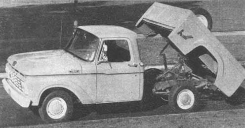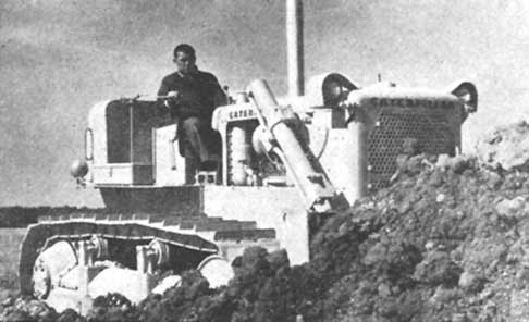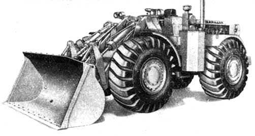 Big, wide-base tires; all-wheel drive, and speeds up to 32 km/in, fwd. or rev. Breakout force: 28,800 kg; operating load capacity: 7,256 kg; dumping height (hinge pin to ground): 446 cm; dumping clearance: 333 cm. Choice of six buckets. Hydraulically actuated. Full torque and 3 speeds. Turning radius 7.6 m.