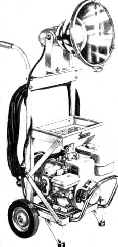 Snap-on El-300 mobile power unit. - Completely portable light and power unit designed for use in virtually any location where electric power is not available. The unit consists of a highly mobile two-wheel cart, a 14-in. (355-mm) diameter flood light, and a very compact alternator which delivers 1,200 watts of 115 volt A.C. electric power. It weighs only 65 lb (29.5 kg), and measures 22 x 14 ½ x 15 ¼ in. (559 x 368 x 387 mm).