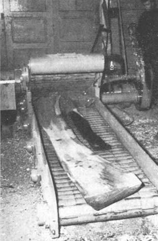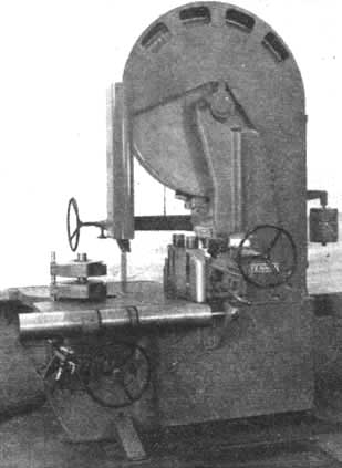 Band resaw type VHL. - The VHL, with 48-in. (1.2-m) diameter saw pulleys for saws 5 ½ in. (140 mm) or 6 in. (152 mm) wide, is suitable for "green" or "dry" sawmills, joinery and furniture workshops. Laborsaving features include: hydraulic feed gear with instant and stepless control of feed speed; horizontal rollers with hydraulic drive and contrarotating roller at the outfeed end for returning timber to sawyer; hydraulically opened and cushioned radial arm, fully flexible and can be canted for bevel sawing; quickly adjusted canting fence with rapid lock; brake and hinged guards for quick saw changing; grouped, easily-operated controls.