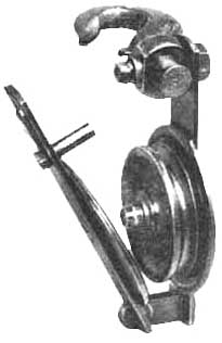 Pulley block. - An opening pulley brook designed for logging work. With an overall length 400 mm and weighing 10 kg, it is supplied either in cast iron or steel with a bronze bushing. It can be opened or looked by turning the hook, and since it is hinged at the lower part of the block it is unaffected by the load and is therefore completely secure.