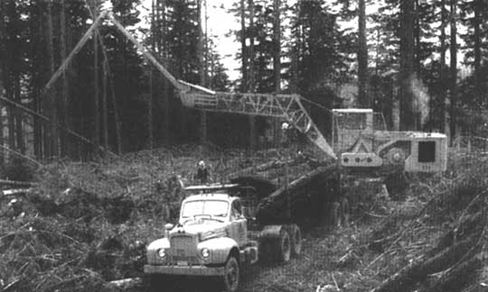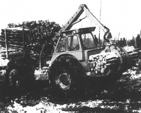 Transporteur pour bois à pâte Koehring. - Véhicule tout terrain d'une grande mobilité pouvant charger sur la coupe des rondins de bois à pâte en bottes de 8 feet (244 cm) de long sans l'aide d'ouvriers. Il peut transporter une charge utile de 3 ½ cunit (3 ½ x 100 ou. ft. massifs de bois à pâte) depuis la coupe jusqu'à la route sans aucun aménagement du terrain. Roues puissantes; direction par articulation centrale du chassis.