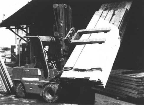 Transporteur à fourche F W D Wagner Modèle 24. - Peut soulever et transporter une charge de 24 000 lb (10 886 kg). Effectue tous les travaux lourds dans un chantier à bois: chargement et déchargement des fardiers et des camions, classement des grumes par essences, empilage des grumes en attente jusqu'aux dimensions de 488 cm, chargement des bassins et alimentation de l'usine et peut manutentionner la charge de 20 fardiers par jour. Convient pour les usines débitant jusqu'à 65 000 ft (19 812 m) par roulement. Les mâchoires peuvent être actionnées ensemble ou séparément.