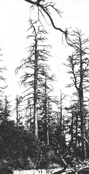 El problema originado por las plagas indígenas se ha complicado por la continua aparición de insectos procedentes de Europa que han resultado ser muy destructores en su nuevo ambiente. Ejemplos notables de esto son la mosca de sierra del alerce, la mosca de sierra de la picea europea, el pulgón lanígero del pino balsámico, la mosca de los brotes del pino europeo y la mosca de invierno.