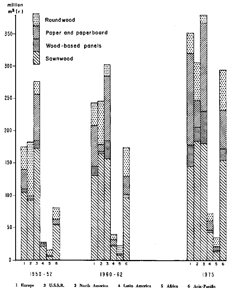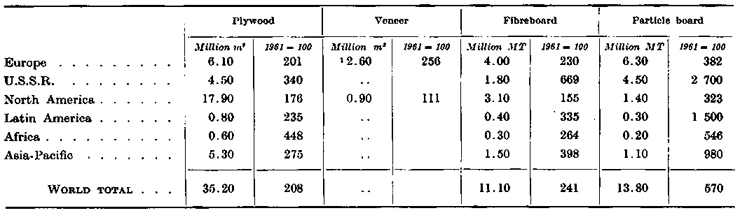 As is shown by the table, the various products which are made from industrial wood raw material experienced sharply different fortunes during the same period. The world's use of wood in the round (pitprops, poles, posts, etc.) did not grow. But world consumption of sawnwood rose by about 30 percent, its use of paper and paperboard grew by about 75 per cent, while consumption of the wood-based panel products grew even faster - with a more than doubling in the quantities of fibreboard used, an almost two-and-a-half times increase in the amount of plywood and the emergence during the decade of a virtually new product, particle board, which by 1961 was being used on a large and very fast-growing scale.