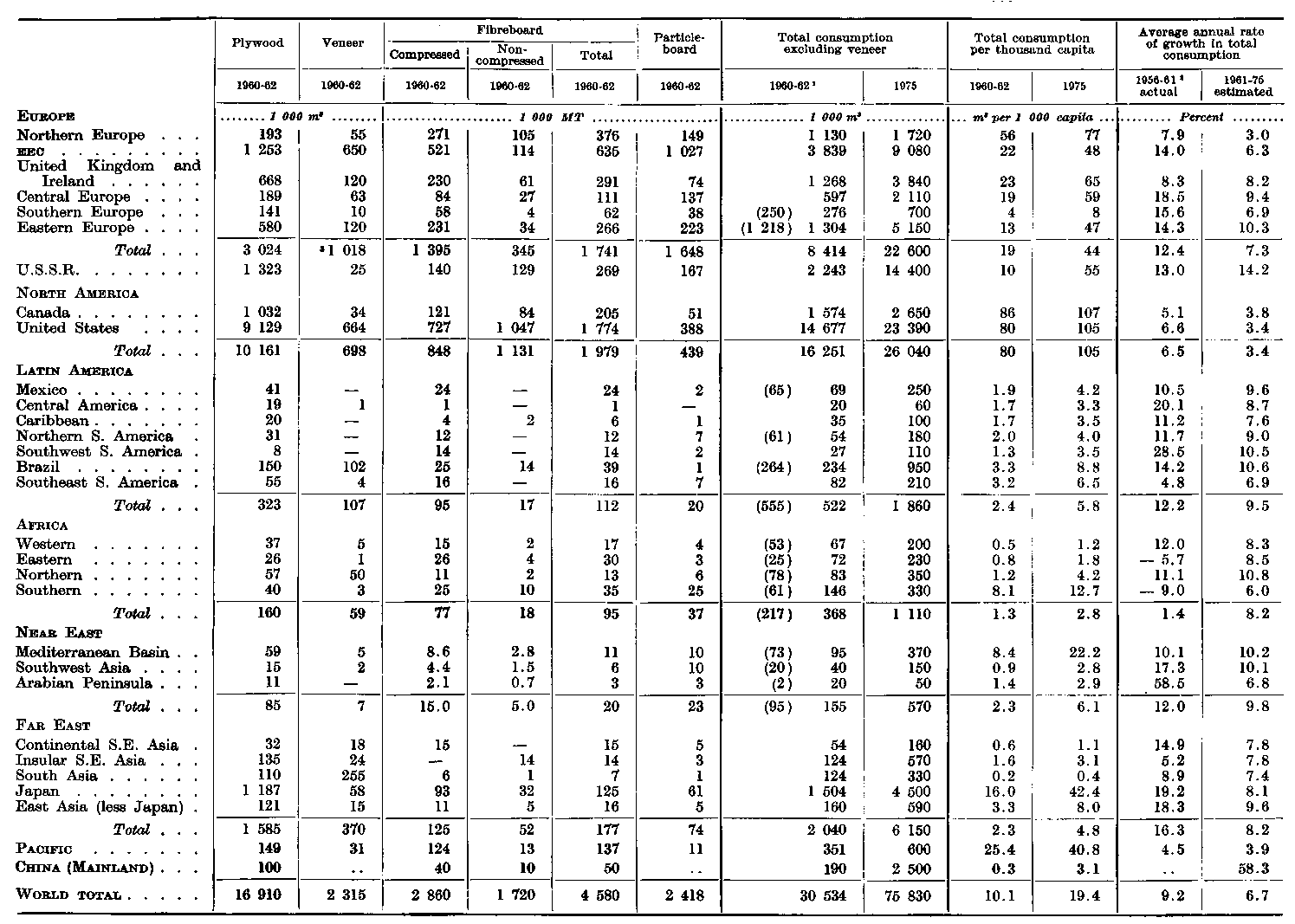 ¹ Figures for 1960-62 are estimated average total annual consumption. Where recorded consumption is significantly different it is shown in brackets. For an explanation of the differences, see the Appendix, - ² Refers to growth in recorded consumption. - ³ In this region a considerable proportion of sawnwood consumed is imported in manufactured form. This is not included in the 1960-62 figures but is allowed for in the estimates for 1975.