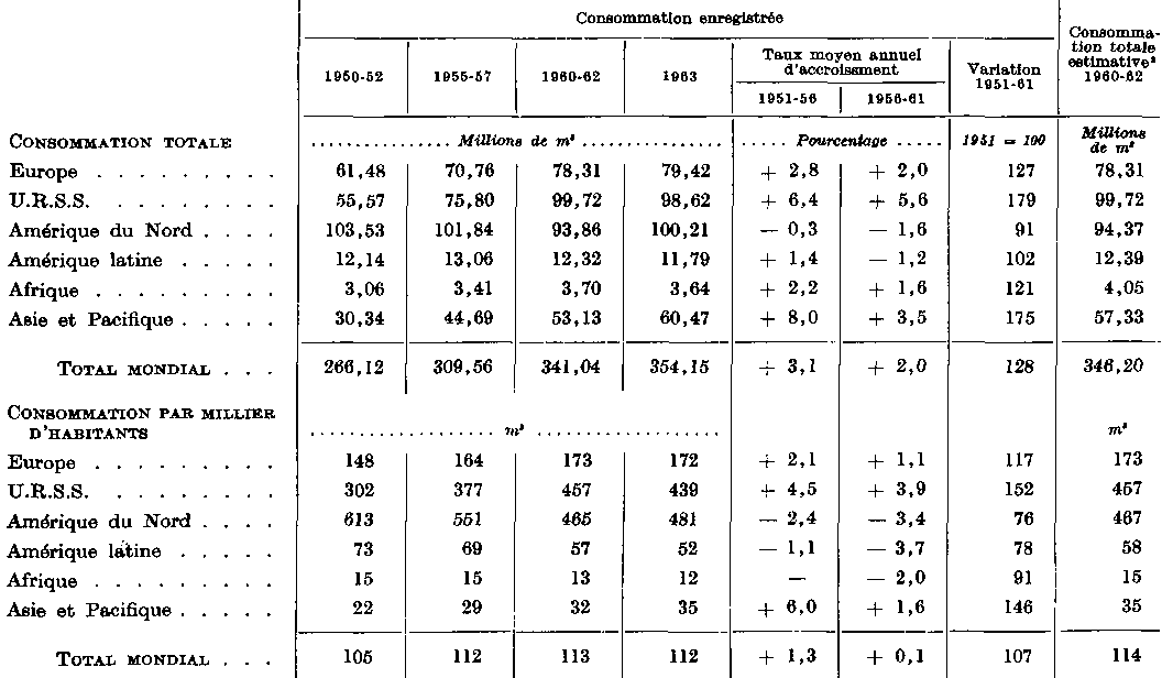 TABLEAU II - 1. - EVOLUTION DE LA CONSOMMATION ENREGISTRÉE DE BOIS ET DE PRODUITS DU BOIS DANS LE MONDE, 1950-52 A 1963